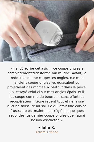 « En tant que mère active s'occupant de trois générations, cet appareil me facilite grandement la tâche. Il vient à bout des ongles épais de mon père et est suffisamment doux pour les petites mains de ma fille. »